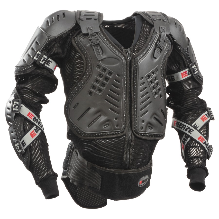 Az EMERZE EM7 testvédő egy védőmellény, amely mell-, gerinc-, váll-, könyök- és alkarvédőkből áll. A protektorok légáteresztő hálós anyagra vannak helyezve, így biztosítják a magas szintű kényelmet és szellőzést menet közben. Köszönhetően a tépőzáras elasztikus pántoknak és cipzáraknak a méret pontosan a test anatómiája szerint beállítható. Az EMERZE EM7 testvédő a motoros felszerelés szerves része, amely növeli a biztonságot motorozás közben.