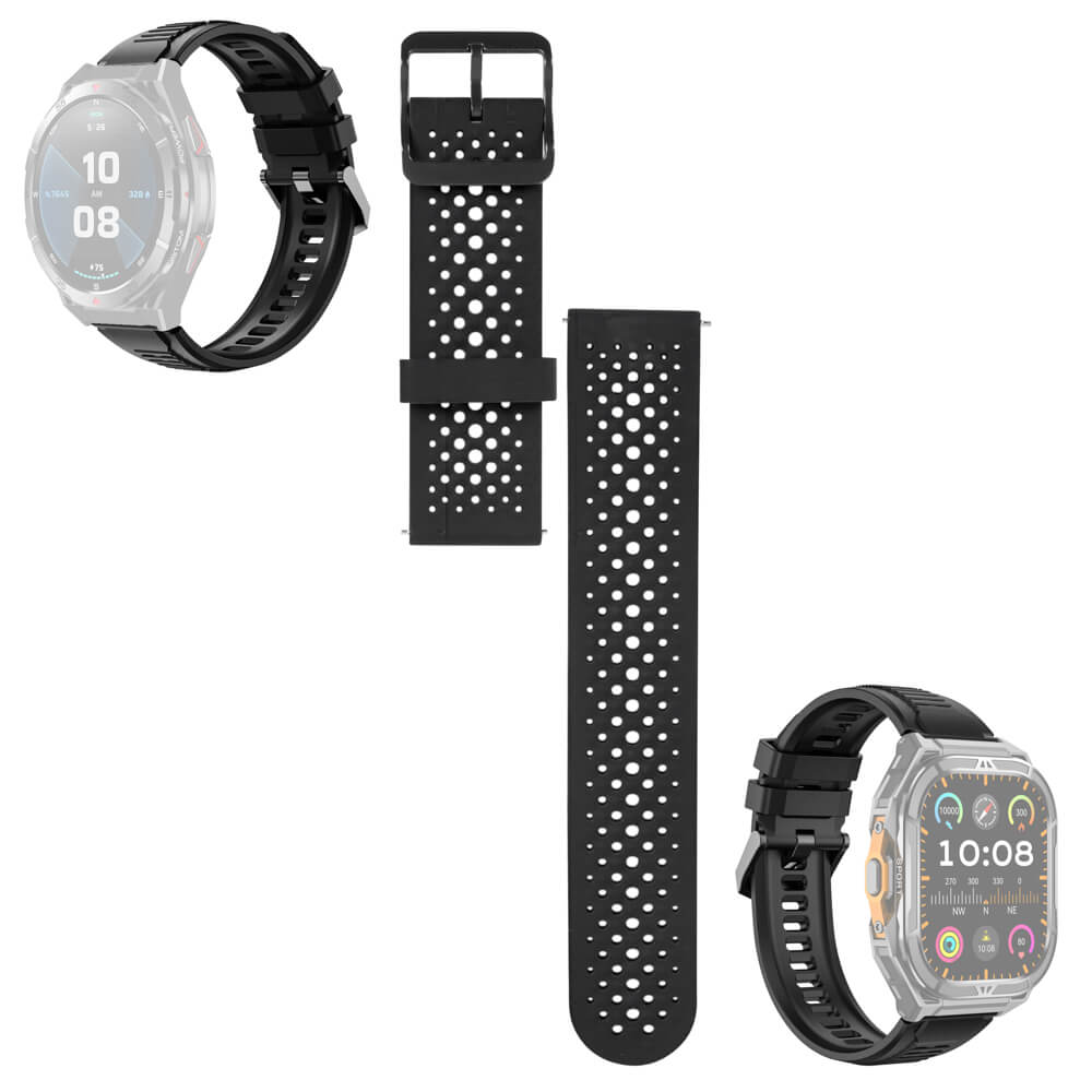 A szíj kiváló minőségű szilikonból készült, ami rugalmas, tartós és kellemes tapintású. A perforált felület nagyszerű légáteresztő képességet és maximális kényelmet biztosít még intenzív edzés közben is. Ráadásul az anyag tökéletesen alkalmazkodik a csuklód alakjához, így viselés közben alig érzed a szíjat.