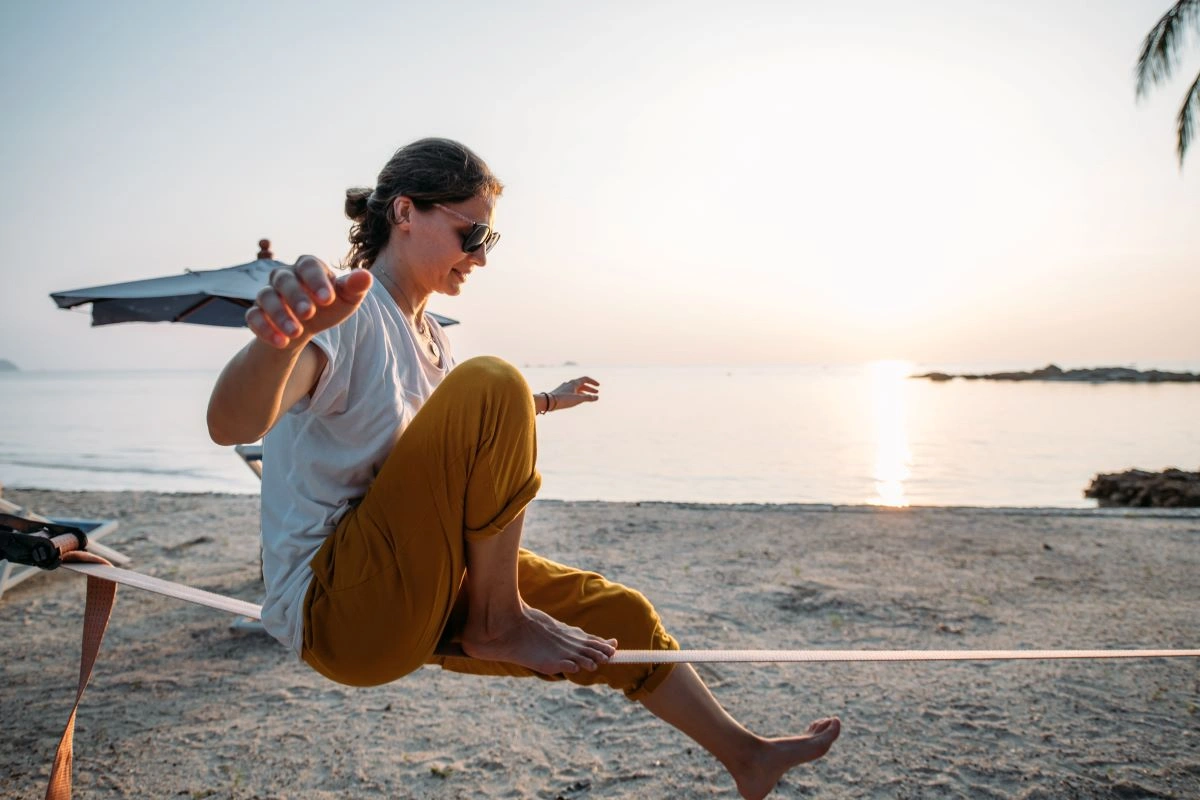Ne kapkodj! Kezdőknél gyakori hiba, hogy minél gyorsabban szeretnének eljutni a slackline másik végére – de így nem fogsz messzire jutni. Épp ellenkezőleg: lassíts, figyeld meg az apró részleteket, engedd meg a testednek, hogy „kiolvassa” a teret maga alatt.
